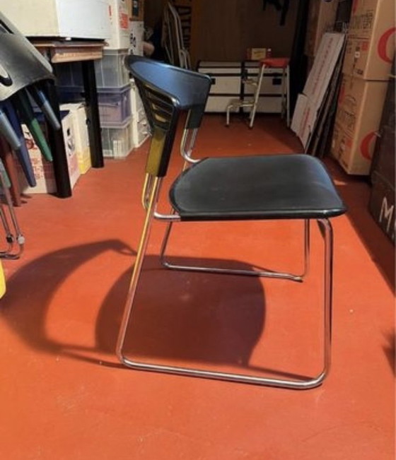Die Stühle bestehen aus einem verchromten Rohrgestell und einer Sitzfläche aus Polypropylen von Press Italy.