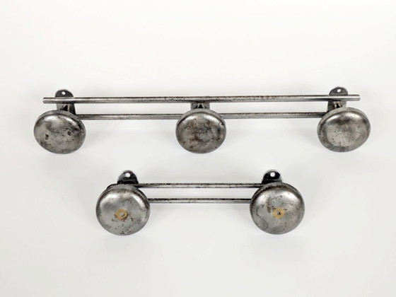 Paar französische Stahlgarderobenständer, industrielle Wandhaken aus den 1950er Jahren mit runden Köpfen