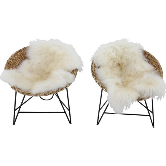 Paar geflochtene Rattanstühle mit Schafsfell, Deutschland 1960