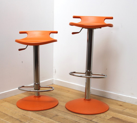 Paar Barhocker Joy, Gaber. Beine aus verchromtem Metall und Sitzfläche aus Kunststoff. Drehbare, höhenverstellbare Hocker und Fußstützen. Max. Sitzhöhe: 78cm Min. Sitzhöhe: 58cm In gutem Zustand. Perfekt für alle Ihre Gastronomiebereiche.