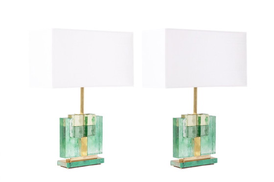 Ein Paar Lampen aus grün irisierendem Muranoglas und vergoldetem Messing in kubischer Form.