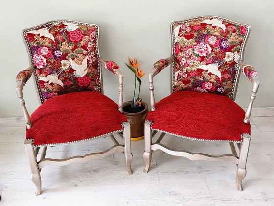 Das leinenfarbene, patinierte Holzgestell betont elegante Kurven und eine raffinierte Silhouette. Die Rückenlehne ist mit einem luxuriösen Stoff bezogen, der japanisch inspirierte Blumen- und Kranichmotive in tiefen Rot-, Rosa- und Goldtönen zeigt. Der großzügige und bequeme Sitz ist mit sattrotem Samt bezogen und mit silbernen Ziernieten dezent akzentuiert.