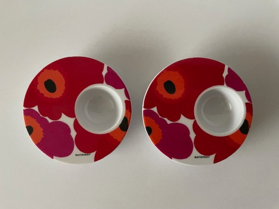 Zwei Eierbecher mit dem klassischen Mohnblumenmuster des finnischen Designers Marimekko in Rot- und Rosatönen. Sehr guter Zustand mit geringen Gebrauchsspuren. Hergestellt aus Melamin von Zak Designs. Durchmesser 9 cm, Höhe 2 cm.