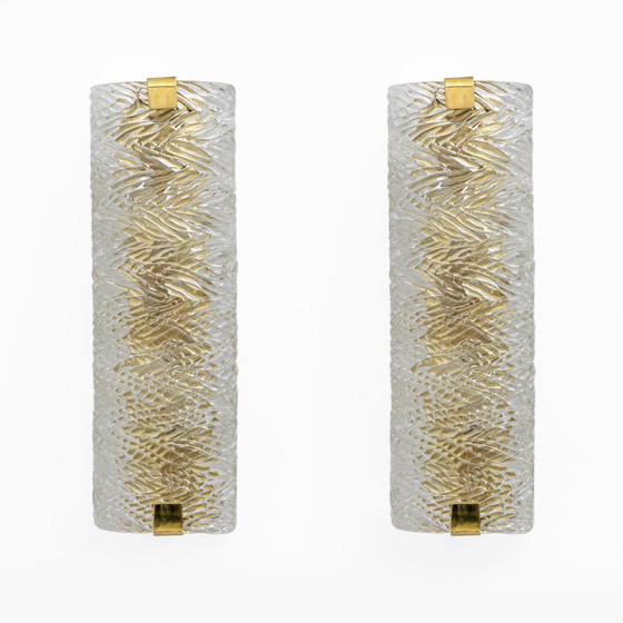 Paar moderne italienische Wandleuchten aus Messing und strukturiertem Muranoglas