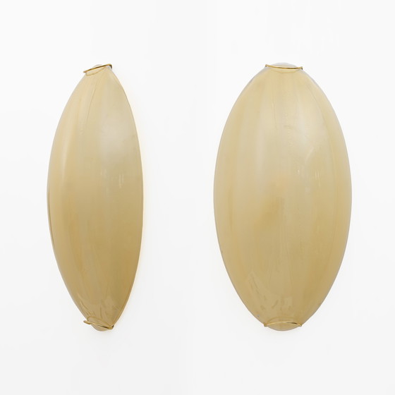 Ein Paar Vistosi-Wandlampen, inspiriert von Form und Farbe einer Muschel, aus mundgeblasenem Glas mit der "Rigadin"-Technik und 24-karätigen Goldeinsätzen. Originalmarke auf dem Glas. Lampenfassung mit E14-Fassung für europäische Standards oder E12 für US-Standards.