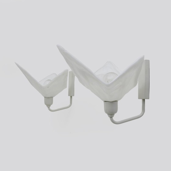 Zwei Wandleuchten der renommierten italienischen Firma La Murrina aus den 1980er-Jahren. Gefertigt aus mundgeblasenem Glas, mit einem Gestell aus milchweiß lackiertem Messing. Die Lampenfassungen sind für E27- oder E26-Glühbirnen (US-Standard) geeignet.