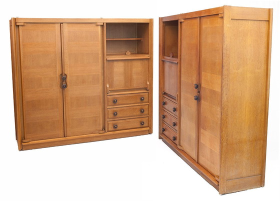 Set aus zwei Schränken aus Eiche. Identische gespiegelte Schränke (linke und rechte Version). Von Guillerme und Chambron. Seltenes Modell aus den Anfängen des Hauses. Doppeltür mit 4 großen Regalen. Türgriffe aus Keramik von Boleslaw Danikowski. Eine Nische mit Ablage. Dry bar oder integrierter Sekretär mit Ablage. Höhe der Tischplatte: 75 cm 3 Schubladen. Sehr guter Zustand. Circa 1950 Kann auch separat verkauft werden.