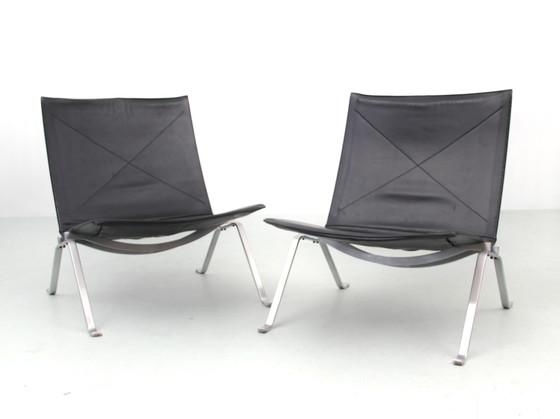 Ein Paar skandinavischer Sessel Modell PK22 von Poul Kjaerholm für Fritz Hansen. Ausgabe aus dem Jahr 1996. Originalbezug aus schwarzem Leder. Sehr schöne Patina.