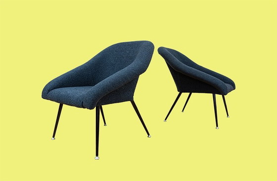 Ein Paar "Köln1"-Clubsessel, hergestellt vom VEB Sitzmöbelwerke Waldheim in Westdeutschland in den 1970er Jahren. Die Stühle und ihre Beine sind aus Metall gefertigt. Bei der Renovierung wurden die Stühle neu gepolstert und mit einem marineblauen Bouclé-Stoff bezogen. Das Modell Köln1 zeichnet sich durch eine tulpenartige Form aus, die Stühle sind bequem und stabil.