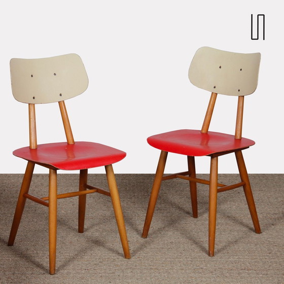 Ein Paar Holzstühle wird von Ton um 1960 in der Tschechischen Republik hergestellt. Die Sitzfläche und die Rückenlehne sind bemalt. Das Set befindet sich in einem Vintage-Zustand. D1406