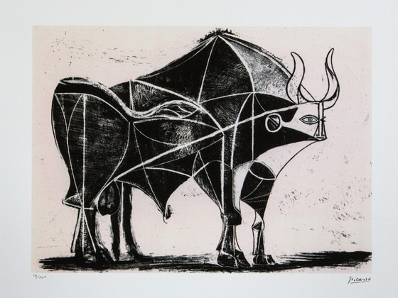 Pablo Picasso (nach) „Der Stier“, Lithografie, limitierte Auflage von 200 Exemplaren, Blattgröße 50 x 70 cm, Platte unten rechts signiert, unten links mit Bleistift nummeriert 14/200, Büttenpapier mit Prägung des Pablo Picasso Museums, ohne weitere Dokumentation, wird ungerahmt verkauft.