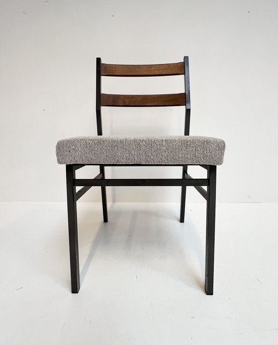 Dieser Vintage-Stuhl ist ein Entwurf aus den 1960er Jahren von Brabantia. Der Stuhl hat ein anthrazitfarbenes Stahlgestell und einen charakteristischen Rahmen aus Palisanderholz. Der Sitz hat eine neue Innenausstattung und ist mit einem trendigen cremefarbenen und grauen Stoff neu gepolstert. Dieser Klassiker kann wieder jahrelang halten!