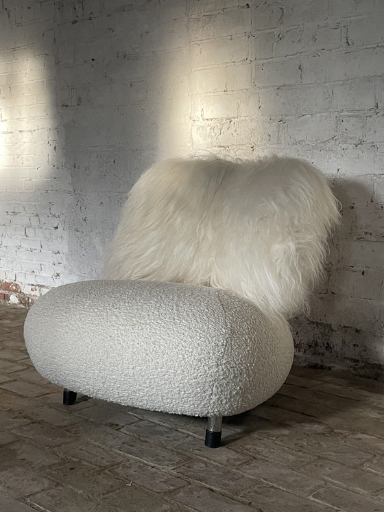 Genießen Sie den luxuriösen Komfort dieses Pallone-Sessels, bezogen mit weichem Bouclé und veredelt mit flauschigem isländischem Schaffell. Er vereint Stil und Gemütlichkeit perfekt und wird so zum Blickfang in jedem Raum.