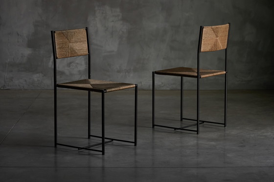 Die Stühle Paludis 150, 1979 von Giandomenico Belotti für Alias entworfen, sind ein raffiniertes Beispiel für italienisches minimalistisches Design. Jeder Stuhl hat ein schlankes, schwarzes Stahlgestell mit klaren Linien, das durch eine handgeflochtene Sitzfläche und Rückenlehne aus natürlichem Sumpfgras (Paludis) ergänzt wird. Diese Stühle sind minimalistisch und dennoch sehr raffiniert und eignen sich für Essbereiche, Studios oder jeden Raum, der raffiniertes, unaufdringliches Design zu schätzen weiß. Das unverwechselbare Flechtmuster auf Sitz und Rückenlehne sorgt für eine visuelle Struktur und ist gleichzeitig langlebig und bequem. Wir haben zwei Stühle im Angebot, Preis pro Stück.