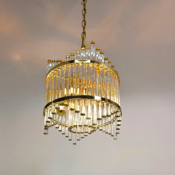 Wunderschöne Vintage-Pendelleuchte von Palwa (Deutschland) aus den 1960er/70er Jahren. Dieses Modell besticht durch den charakteristischen luxuriösen Look, für den Palwa bekannt ist: ein vergoldetes Messinggestell und zahlreiche, stufenförmig angeordnete Glasröhren.