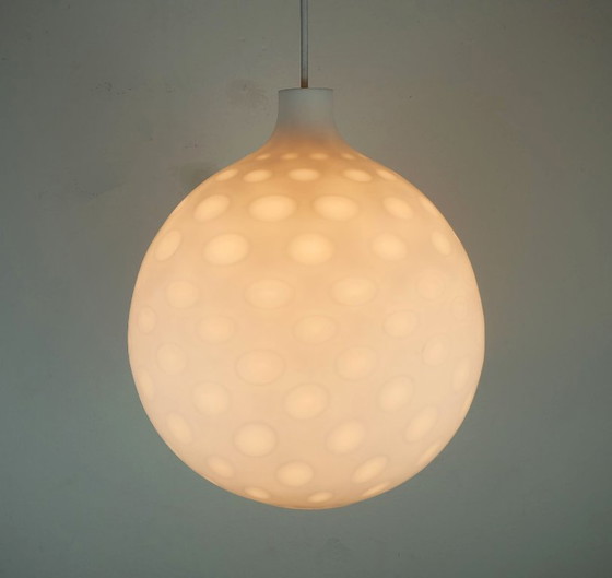 Sehr elegante, klassische Hängelampe „Lissabon“ von Peill & Putzler. Entwurf von Aloys Ferdinand Gangkofner aus den 1950er-Jahren. Großer, runder Schirm aus weißem Opalglas. Modellnummer 9000. Dieses Modell wird oft auch „Como“ genannt, im Originalkatalog von Peill & Putzler aus den Jahren 1976/77 jedoch als „Lissabon“ geführt.