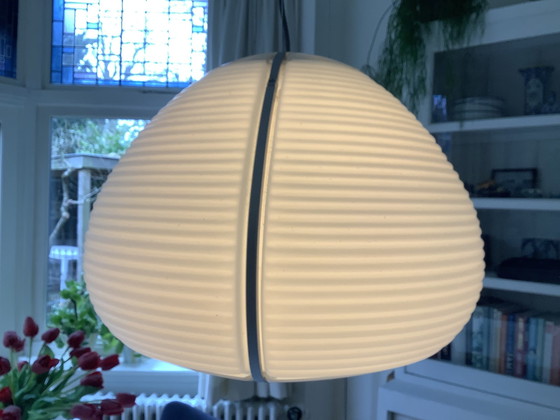 Seltene Fontana Arte Pendelleuchte bestehend aus Milchglas, Kunststoff und 3 Metallstreifen. Die Aufhängung erfolgt über 3 Metalldrähte. Die Schnur ist vollständig intakt und die Aufhängung hat einen weißen Schirm.