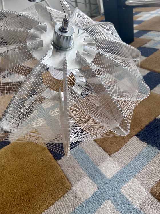 Eine markante Pendelleuchte im Space-Age-Stil von Sompex, entworfen von Paul Secon. Der abstrakte Schirm besteht aus Nylonfäden in Kombination mit Plexiglaselementen und erzeugt so einen skulpturalen und lichtstreuenden Effekt. Eine kühne und ausdrucksstarke Leuchte – ein echtes Original der 1970er-Jahre. Maße: Höhe 15 cm, Breite 50 cm.