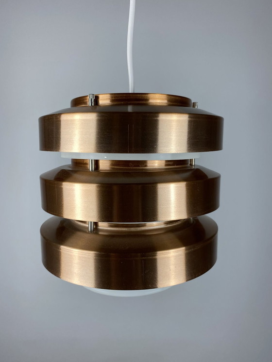 Elegantes Design aus den 1970er Jahren vom VEB Metalldrücker Halle aus der DDR, Ostdeutschland. Hergestellt aus Metall und kupferfarbenem Metall. Die 3 Ringe werden von 3 Stiften gehalten, so dass das Licht durch die Ringe hindurchscheint. Bietet sehr warmes Licht durch die verschiedenen Ringe. ABMESSUNGEN Höhe: 17,5cm Durchmesser: 18cm Kordellänge: 80cm PRODUKT DETAILS Zustand: Sehr gut - minimale Gebrauchsspuren Material: Metall Fassung: E27 Inklusive Glühbirne und Deckensockel Hersteller: VEB Metalldrücker Halle Produktionszeitraum: 1970 Herkunftsland: DDR, Ostdeutschland