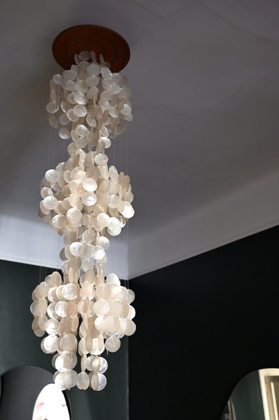 Diese imposante Hängeleuchte besteht aus drei übereinander liegenden Teilen und ist aus unzähligen Perlmuttlamellen zusammengesetzt.