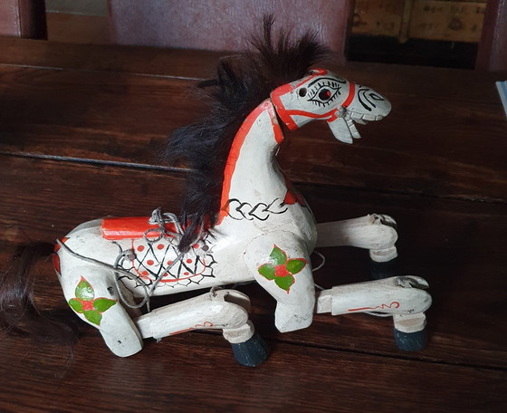 Pferdepuppenfigur aus Holz, handgeschnitzt und mit echtem Pferdehaar. Bewegliche Gliedmaßen mit Hilfe von Schnüren. Bemalt in weiß, grün, rot, schwarz. Höhe 33cm, Länge 22cm, Breite 10cm, Gewicht 0,600kg. Es ist ein altes Stück mit Gebrauchsspuren (siehe Fotos). Die Querstange zum Bewegen der Saiten ist nicht vorhanden. Trotzdem ein sehr schönes Stück.