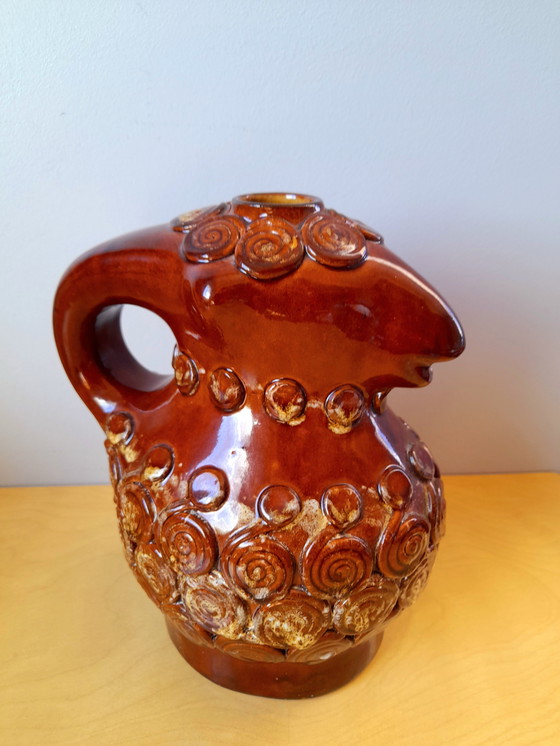 Dieser charmante zoomorphe Keramikkrug in Form eines Schafes stammt aus den 1950er Jahren. Die satte braune Glasur und das komplizierte Wirbelmuster verleihen jeder Sammlung einen Hauch von Vintage-Eleganz. Ob als Ausstellungsstück oder als Gebrauchsgegenstand, dieses Stück ist ein reizvolles Beispiel für die Keramikkunst der Mitte des Jahrhunderts.