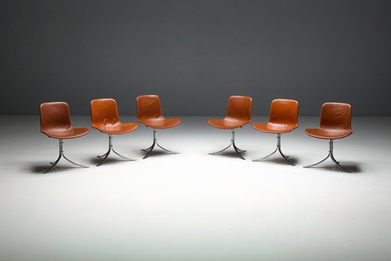 Dieses seltene Set der PK9-Esszimmerstühle aus der ersten Auflage wurde von Poul Kjærholm entworfen und in den 1960er-Jahren von E. Kold Christensen in Dänemark gefertigt. Jeder Stuhl besticht durch ein skulpturales Dreibeingestell aus gebürstetem Edelstahl und ist mit warmem cognacfarbenem Leder bezogen, das eine wunderschöne natürliche Patina entwickelt hat. Die minimalistische Formgebung spiegelt Kjærholms meisterhafte Verbindung von Industriematerialien mit zeitloser Eleganz wider. Alle Stühle tragen den Original-Herstellerstempel, der ihre Authentizität garantiert.