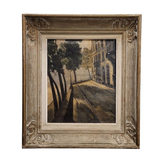 Dieses eindrucksvolle Ölgemälde auf Leinwand zeigt die Gegend um Pont Marie in Paris in der Abenddämmerung. Es präsentiert eine ruhige und zugleich melancholische Stadtszene. Trotz der Dunkelheit werfen die Straßenlaternen und Bäume lange Schatten auf den Bürgersteig – ein Zeichen für das Ende des Tages. Der Baustil und die erdigen Farben sind charakteristisch für diesen Teil der Stadt. Die Verwendung dieser gedeckten, erdigen Töne verleiht dem Gemälde eine warme und einladende Atmosphäre, während die Schatten der Bäume und Gebäude einen subtilen Kontrast bilden und die introspektive und nostalgische Stimmung verstärken. Der Künstler konzentriert sich darauf, die Schönheit der Stadtlandschaft einzufangen, ohne eine vordergründige Botschaft oder einen gesellschaftlichen Kommentar zu vermitteln – ein Aspekt, der ihn mit dem Postimpressionismus verbindet. Die Pinselstriche sind locker und sichtbar (typisch für die Impressionisten), was den Eindruck von Bewegung und sein Interesse am wechselnden Lichtspiel unterstreicht.