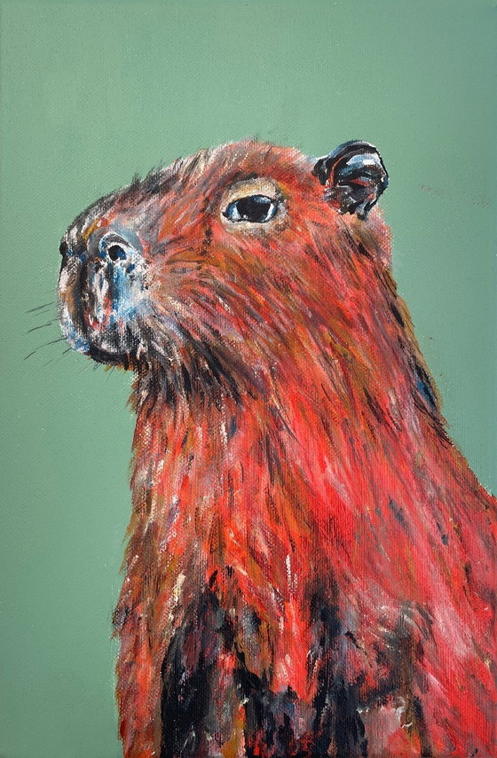 Porträt eines Wasserschweins. Gemalt auf Leinwand. Titel: Herr Wasserschwein. 20 x 30 x 2 cm (dunkelgrüner Hintergrund). Gemalt von Britt Kleiberg, geboren 1980 in Amersfoort. Ihr Atelier befindet sich in Harderwijk. Britt malt Tiere aus aller Welt mit einer Geschichte. Während der Corona-Zeit hat sie die niederländischen Vögel besonders in den Fokus gerückt! Jetzt malt sie Tiere aus ferneren Ländern in einer Art Reisepass-Komposition. – Sie absolvierte ein Studium in Grafikdesign und Styling, bevor sie ihre Berufung in der zeitgenössischen Kunst fand. Aufgewachsen in einer kunstbegeisterten Familie, kam sie schon früh mit Kunst in Berührung und begann im Alter von 10 Jahren zu malen. Sie liebte Museumsbesuche und ist dankbar für die frühe künstlerische Bildung, die ihr den Grundstein für ihren heutigen Weg als zeitgenössische Künstlerin legte. Positivität, Farben und Bewegungsfreiheit. Der Einsatz von Farbe ist ein wichtiger Bestandteil ihres künstlerischen Vokabulars: „Farben machen die Menschen glücklich, und ich möchte Freude und Positivität in die Welt bringen.“ Ihre Farbpalette kann die natürliche Umgebung eines Tieres, eine Jagd oder eine Emotion widerspiegeln. Je nachdem, was sie ausdrücken möchte. Und so zurückhaltend der Hintergrund auch sein mag, er ist ebenfalls Teil davon. Sie verwendet seltsame, kleine Farbformen, um ihre Tiere zu „füllen“. „Diese stellen imaginäre Kontinente dar“, erklärt sie, „und können die Gebiete symbolisieren, zu denen das Tier gehört oder wo es sein möchte. In meiner künstlerischen Welt ist alles möglich.“ Mehr Arbeiten: www.britt-art.nl Dieses Gemälde ist auch in der kommenden Ausstellung „Himmlisch“ zu sehen, die am 17. Januar in der Catharinakapel in Harderwijk beginnt. Herzlich willkommen!