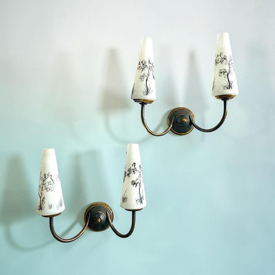 Die Leuchten sind aus Messing gefertigt und mit weißen Glasschirmen mit einem zarten, von der Natur inspirierten schwarzen Muster versehen.