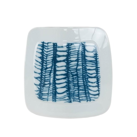 Weißes Porzellan mit moderner, geometrischer Form und dekorativem Kobaltmuster im Inneren. Das minimalistische Design vereint skandinavische Schlichtheit mit der für die dänische Designschule charakteristischen Eleganz.
