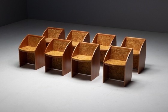 Seltene postmoderne Stühle, die skulpturale Formen mit kühnen Materialkontrasten verbinden. Jedes Stück weist eine geometrische Silhouette aus edlem Holz auf, gepaart mit gepressten Spanplatten, die Textur und rohe Eleganz betonen. Die gewölbten Seiten und kantigen Schnitte erzeugen eine ausgeprägte architektonische Präsenz, die diese Stühle sowohl zu Kunstobjekten als auch zu funktionalen Sitzgelegenheiten macht. Diese Stühle sind ideal für Esszimmer oder Kreativstudios und verkörpern den verspielten und doch raffinierten Geist des postmodernen Designs. Preis für ein Set von 8 Stühlen.