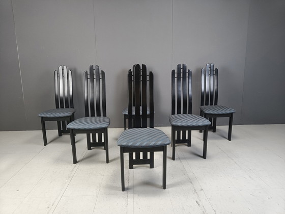 Postmoderne Esszimmerstühle mit schwarz lackiertem Holzgestell und originaler Stoffbespannung aus den 1980er Jahren. Elegantes Design. Guter Gesamtzustand. 1980er Jahre - Belgien Abmessungen: Höhe: 110cm Breite: 50cm Tiefe: 45cm Sitzhöhe: 45cm Preis gilt für das Set. Ref.: 24121003