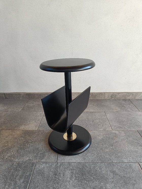 Ein schlichtes und funktionales Designstück, das eine runde Tischplatte mit einem integrierten Seitenfach für Zeitschriften, Bücher oder Schallplatten kombiniert. Das Gestell besteht aus schwarz lackiertem Metall mit Holzelementen und einem eleganten Messingdetail am Fuß.