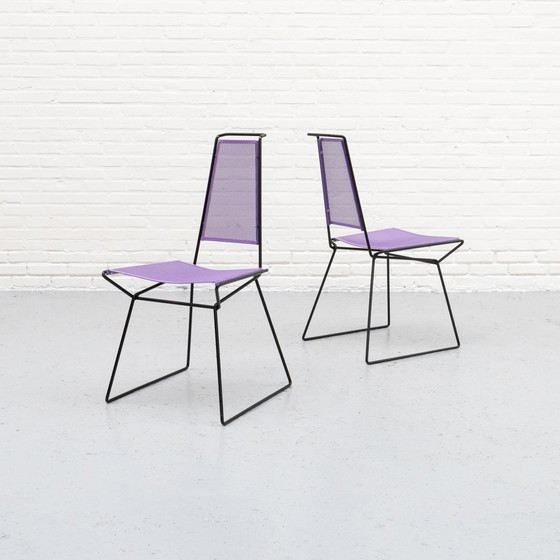 Esstischstuhl aus Metall, entworfen von Rolf Rahmlow in den 1980er Jahren. Ein postmodernes Design mit perforiertem Metall und einem violetten Metallrohrgestell. Zwei Stück verfügbar, Preis pro Stück.