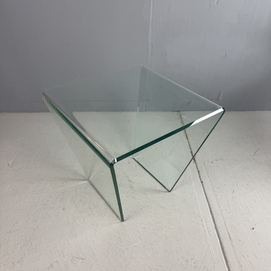Postmoderner Couch- oder Beistelltisch aus Glas, 1980er Jahre. Gefertigt aus einer dicken Glasplatte, die zu einer umgekehrten Pyramidenform gebogen ist. Die facettierten Kanten zeugen von handwerklichem Können und erzeugen ein schönes Lichtspiel. Liebhaber von minimalistischem und geometrischem Design kommen hier voll auf ihre Kosten!
