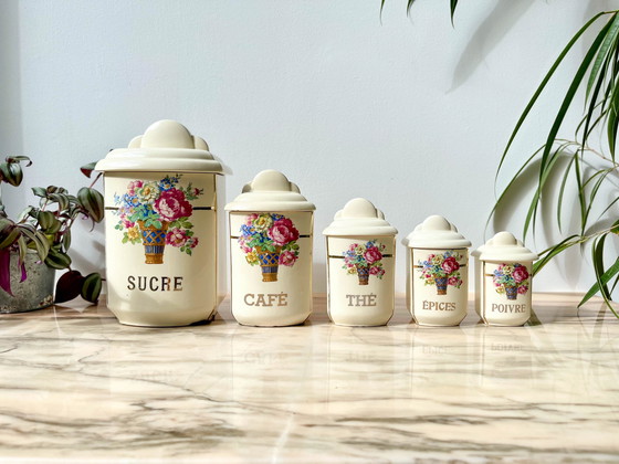Sehr schönes Set aus 5 Gewürzgläsern aus Steingut Digoin Sarreguemines Made in France. Das Set besteht aus einem Topf für Zucker, Kaffee, Tee, Gewürze und Pfeffer.