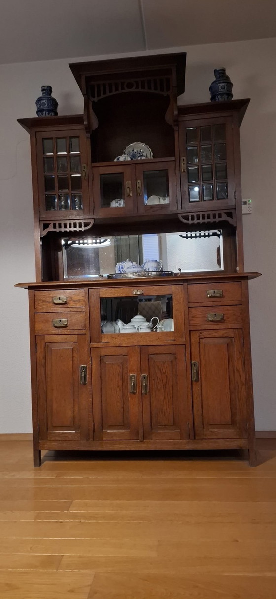 Dieser exquisite antike Buffetschrank aus massiver Eiche strahlt zeitlose Eleganz und Raffinesse aus. Sein satter Braunton und die filigranen Details machen ihn zu einem herausragenden Möbelstück für jedes klassische Interieur.