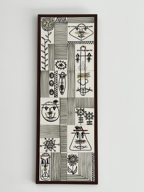 Hervorragende glasierte Keramikplatte, datiert 1964* und signiert A. Frans. Mit seinen stilisierten Gesichtern und grafischen Mustern erinnert dieses Werk stark an die Welt von Roger Capron, einer emblematischen Figur der modernistischen Keramik der 50er und 60er Jahre. Es soll wie ein Gemälde an der Wand befestigt werden, kann aber durch das Anbringen von Beinen auch in einen Couchtisch verwandelt werden und bietet so eine doppelte Nutzungsmöglichkeit. – Abmessungen: 95 cm x 34 cm – Datierung: 1964 – Signatur: A. Frans – Zustand: guter Allgemeinzustand. Anmerkung: ein alter Unfall auf der Fliese in der oberen rechten Ecke sowie winzige Brennrisse (original und ohne strukturelle Brüchigkeit). Seltenes und elegantes Dekorationsstück, ideal für Liebhaber von Vintage-Design und modernistischer dekorativer Kunst.