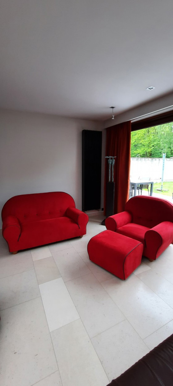 Ervaar de elegantie van deze prachtige design zitgroep van het gerenommeerde Franse merk Cinna. Deze set, bestaande uit een tweezitsbank, een ruime fauteuil en een bijpassende poef, straalt in een opvallende rode kleur die elke ruimte tot leven brengt.