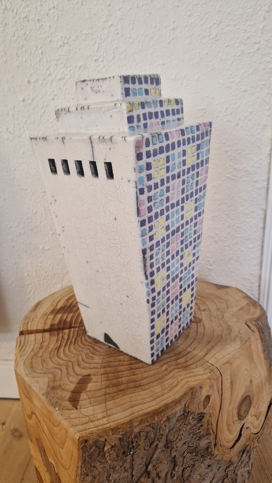 Keramikobjekt von Carla Dijk. Dieses Stück ist im Raku-Verfahren gebrannt. Carla lässt sich in ihren Kunstwerken häufig von architektonischen Formen inspirieren und zeichnet sich durch dezente, farbenfrohe Verzierungen aus.