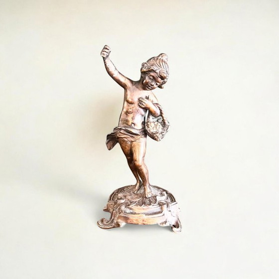 Wunderschöne kleine Bronze des französischen Bildhauers Farbel. Genannt "die Cueilette" (die Laube). Sie zeigt eine junge Frau nur bekleidet mit einem Tuch und einem Korb voller Früchte. Tadelloser Zustand.