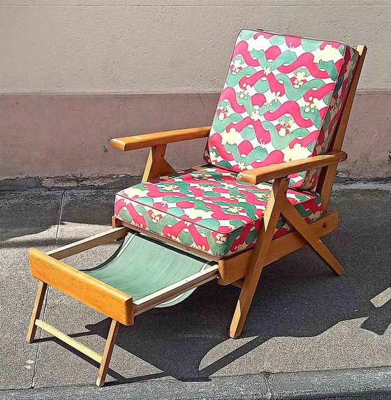 Relaxsessel Cosy Mon Rêve 50er Jahre Blond lackiertes Holz (Buche oder Ulme) Verstellbare Rückenlehne und verstellbare Liegeposition Originalgarnitur in gutem Zustand, muss jedoch abgestaubt werden Das Fußstützenkissen fehlt. Im eigenen Saft Einige Gebrauchsspuren auf dem Lack. Nichts Ernstes. Abmessungen: Höhe 96,5 cm Breite 64,5 cm Sitztiefe 78 cm Sitzhöhe 42 cm Höhe Armlehnen 58 cm Dicke der Kissen 11 cm. Sorgfältig verpackt. Verfolgter Versand