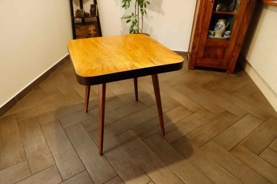 Ein eleganter Couchtisch aus den 1950er-Jahren, hergestellt vom staatlichen Unternehmen Český nábytek Týniště nad Orlicí. Die Tischplatte wurde teilweise restauriert, die Beine sind im Originalzustand erhalten. Ein typisches Beispiel tschechoslowakischen Möbeldesigns jener Zeit, das handwerkliches Können und ästhetische Schlichtheit betont.