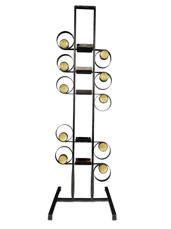 Solide Metallkonstruktion mit neun runden Halterungen für Blumentöpfe.