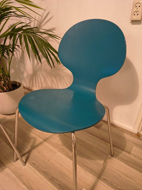 Die Stühle sind türkisblau und haben ein verchromtes Gestell.