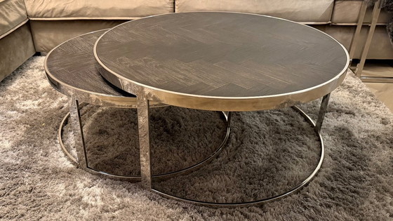 Exklusives Couchtisch-Set von Richmond Interiors, gefertigt aus dem beliebten Blackbone-Holz mit einem eleganten silberfarbenen Metallgestell.