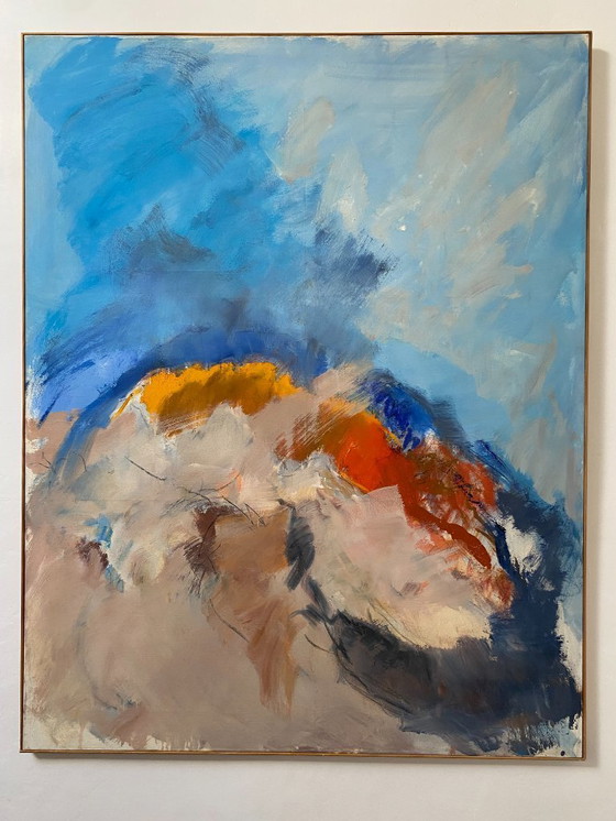 Dieses abstrakte Werk erkundet eine dynamische Welt aus Farbe und Bewegung. Blautöne dominieren den oberen Teil und suggerieren den Himmel oder eine endlose Wasserfläche, wobei subtile Schattierungen von Hell- und Dunkelblau eine beeindruckende Tiefe erzeugen. In der Mitte kontrastieren leuchtende Gelb- und Orangetöne kräftig mit kühleren Tönen, die an eine belebende Energie erinnern. Die braunen und schwarzen Akzente an der Basis verankern die Komposition und fügen eine irdische Dimension hinzu. Die Pinselstriche sind ausdrucksstark, fast chaotisch, aber gekonnt beherrscht und vermitteln eine pulsierende emotionale Intensität. Der gewagte Einsatz von Farbe und Textur verwickelt den Betrachter in eine persönliche Interpretation und verwandelt jeden Blick in eine neue Entdeckung. Das Gemälde verkörpert eine kühne Harmonie zwischen Chaos und Ruhe und lädt zu einer introspektiven Reflexion über die Dynamik der Natur und des menschlichen Geistes ein.