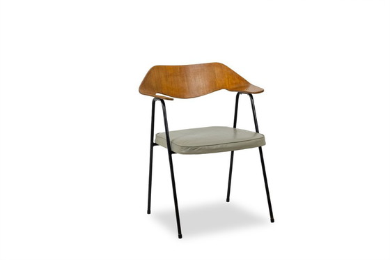 Von Robin Day in den 1950er Jahren entworfener Bürosessel mit Rückenlehne und Armlehnen, die aus einem Stück Thermoholz gefertigt und mit Teakholz furniert sind. Untergestell aus schwarz lackiertem Metallrohr. Sitzfläche aus hellgrauem Kunstleder.