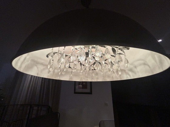 Diese originelle Pendelleuchte besticht durch ihr robustes Design mit einem modernen, eleganten Touch dank des integrierten Kronleuchters. Der Metallschirm mit einem Durchmesser von 90 cm (45 cm hoch) fügt sich perfekt in ein modernes, industriell inspiriertes Interieur ein. Die Höhe von der Decke bis zum unteren Rand des Schirms beträgt ca. 1,15 m und kann mit einer zusätzlichen Kette verlängert werden.